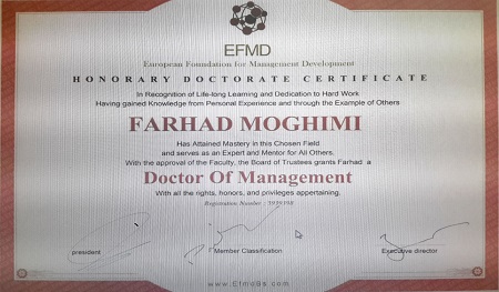 جناب آقای مهندس فرهاد مقیمی رئیس هیات مدیره سازمان مردم نهاد دوستاران آوای طبیعت استان تهران موفق به دریافت دکترای افتخاری مدیریت از بنیاد اروپایی EFMO گردید